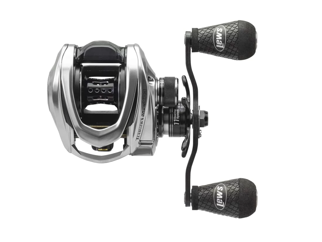 The top choice when you’re looking for a super low profile baitcaster. The lightest reel in Lew’s collection, built on C45 carbon side plates. The 11-bearing system is double-shielded stainless steel, with an anti-reverse clutch bearing. A 95mm carbon fiber handle with custom Winn Dri-Tac knobs for better control. 20lbs of fish-stopping drag. This baby handles light line and lures better than traditional baitcasting reels. No sacrifice in power or performance. Smooth as butter on hot toast.