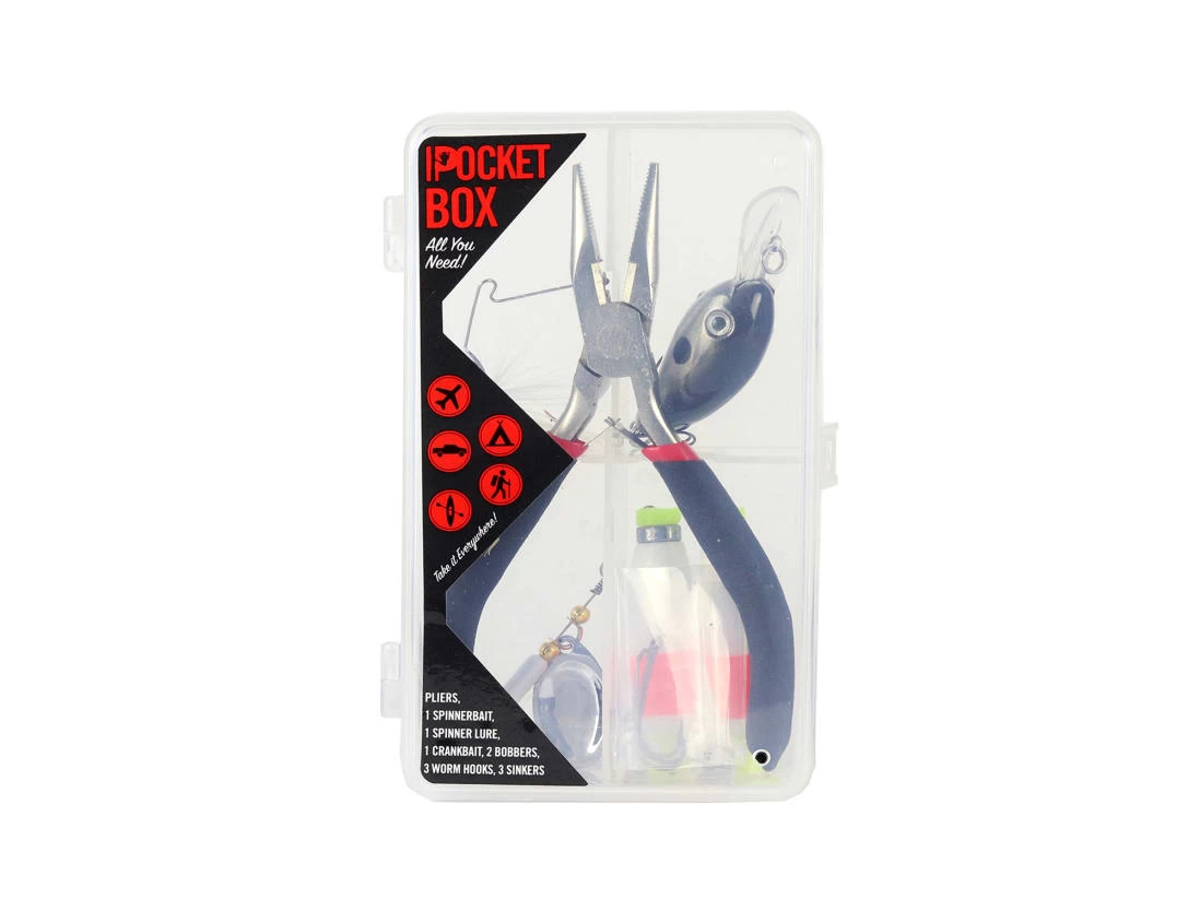 The Loaded Pocket Tackle Box is pretty much everything you need, all in one place. When youโre looking to jump right in, this grab-and-go situation is the move. Bobbers and sinkers? We got โem. The in-line spinner, crankbait, and spinnerbait cover a range of settings and species. A solid set of mini pliers and 3 worm hooks complete the kit. This box will have you ready to catch lunkers anywhere, anytime.